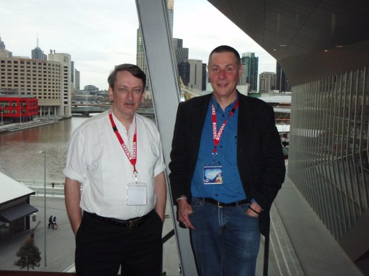 I attended Aussiecon IV, the 68th World Science Fiction Convention in my home town of Melbourne, Australia in September. It was great to catch up with old friends, writers, editors and book-lovers that I had not seen for some time. I was delighted to be there to see Shaun Tan, who illustrated my children’s book, The Stray Cat, win the Hugo Award for Best Professional Artist.