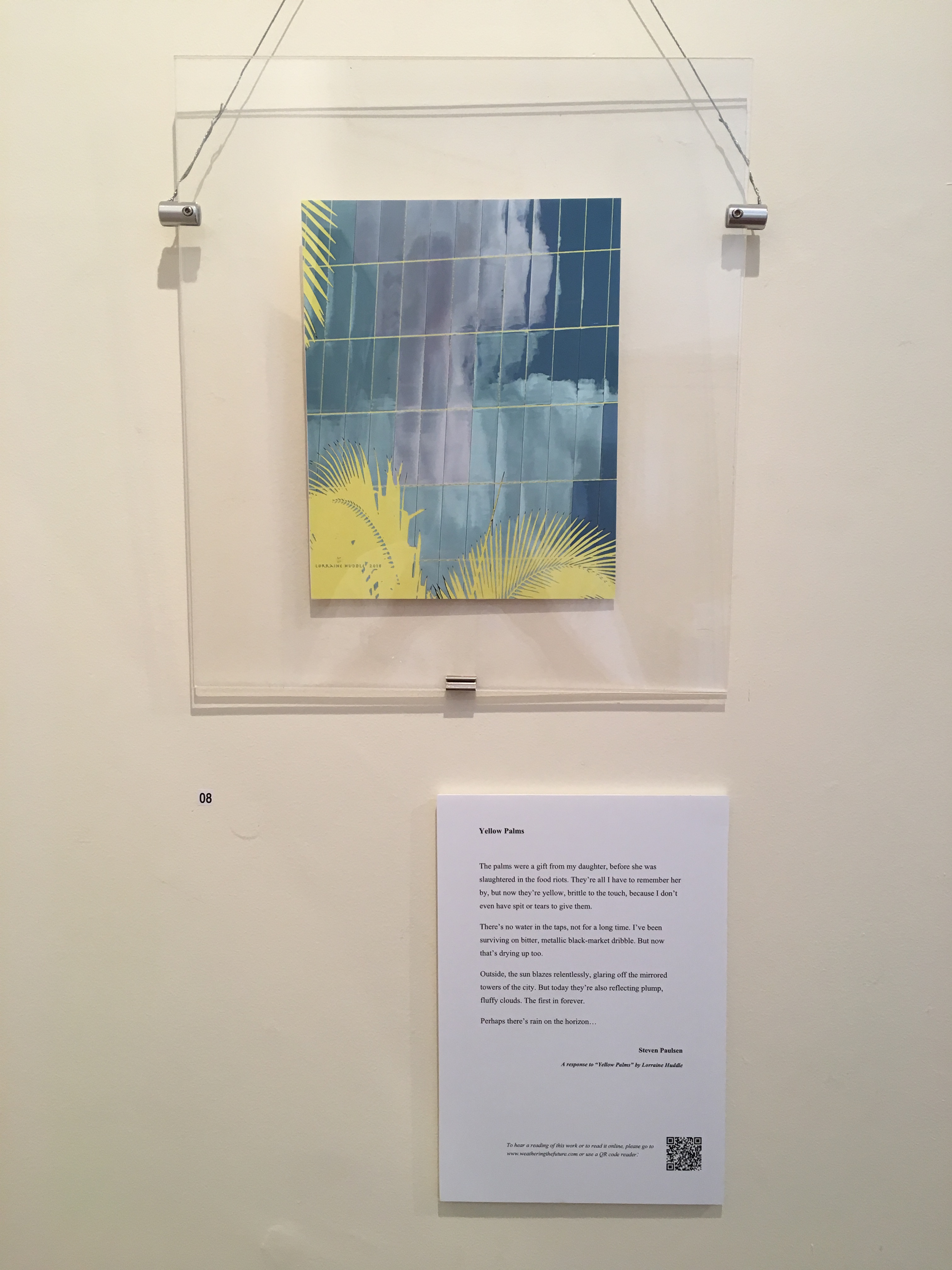 I have a short story titled “Yellow Palms” published the Weathering the Future exhibition, a collaboration between Ballarat Words Out Loud, the Soldiers Hill Artist Collective (SHAC), and communication design students from Federation University’s Arts Academy. The exhibition is curated and convened by writers Jason Nahrung and Kirstyn McDermott.