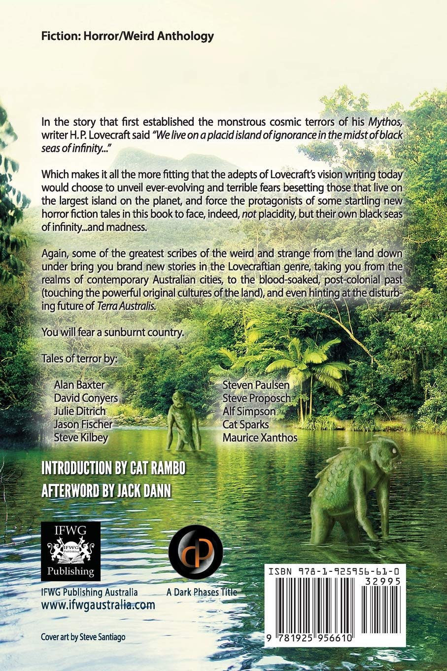 The publisher, Gerry Huntman, says the anthology brings together “some of the greatest scribes of the weird and startling from the land down under bring you brand new stories in the Lovecraftian genre, taking you from the realms of contemporary Australian cities, to the blood-soaked, post-colonial past (touching the powerful original cultures of the land), and even hinting at the disturbing future of Terra Australis.”