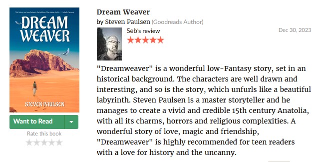 DREAM WEAVER – FANTASTIC 5 STAR REVIEW On December 31, 2023October 7, 2025 By Steven Paulsen A wonderful 5 star review of Dream Weaver to end the year! https://www.goodreads.com/review/show/6096855116 Share this: Click to share on X (Opens in new window) X Click to share on Facebook (Opens in new window) Facebook Like Loading...